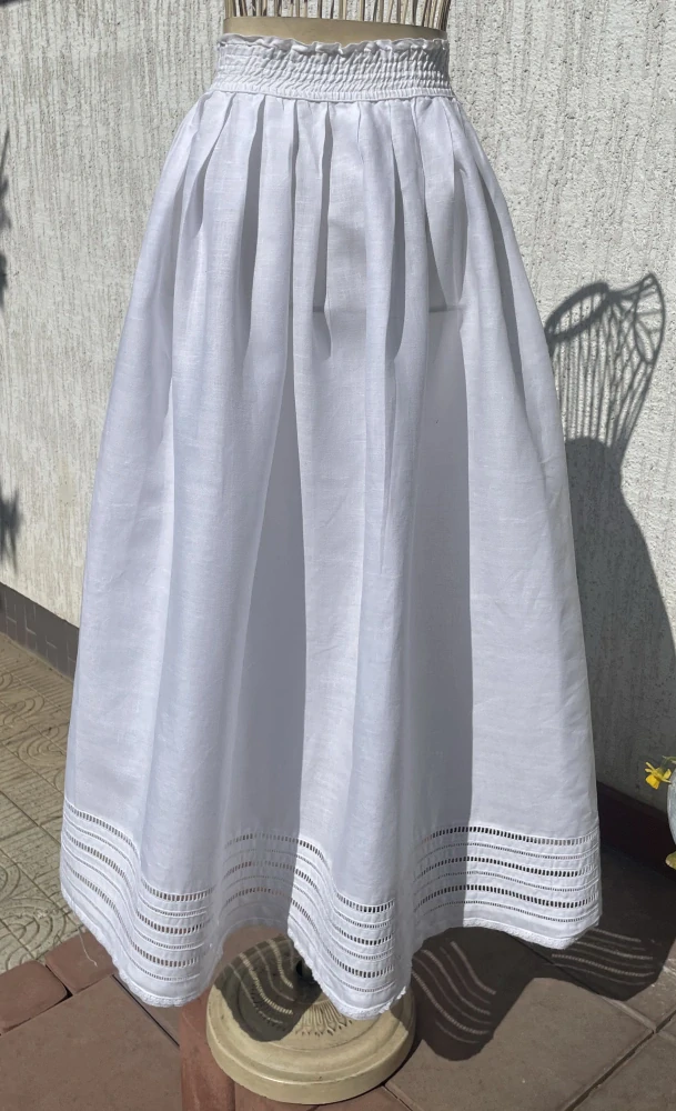 Dlouhá bílá sukně s gumou v pase, guma už je vytahanější, už moc nepruží, sukně má jeden nažloutlý flíček a uvnitř gumy trochu nažloutlá, materiál odhaduji na bavlnu, velikost odhaduji na 40/42,  celkový dojem je stále pěkný.