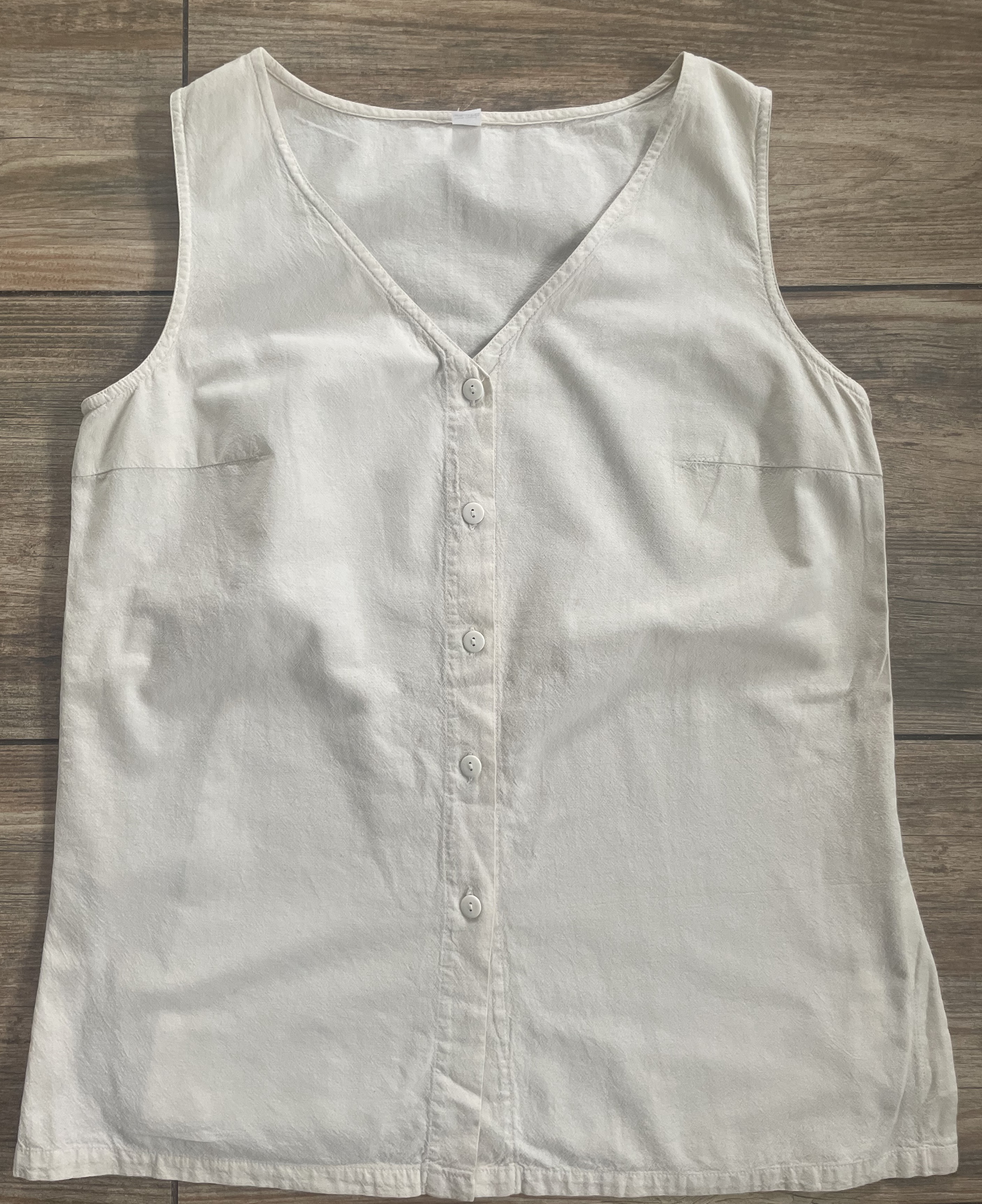 100% bavlna, smetanová barva lehounká, délka 77,5cm, šíře přes prsa 56cm, vel. odhaduji na 40-42 Velikost: 40 celý popis