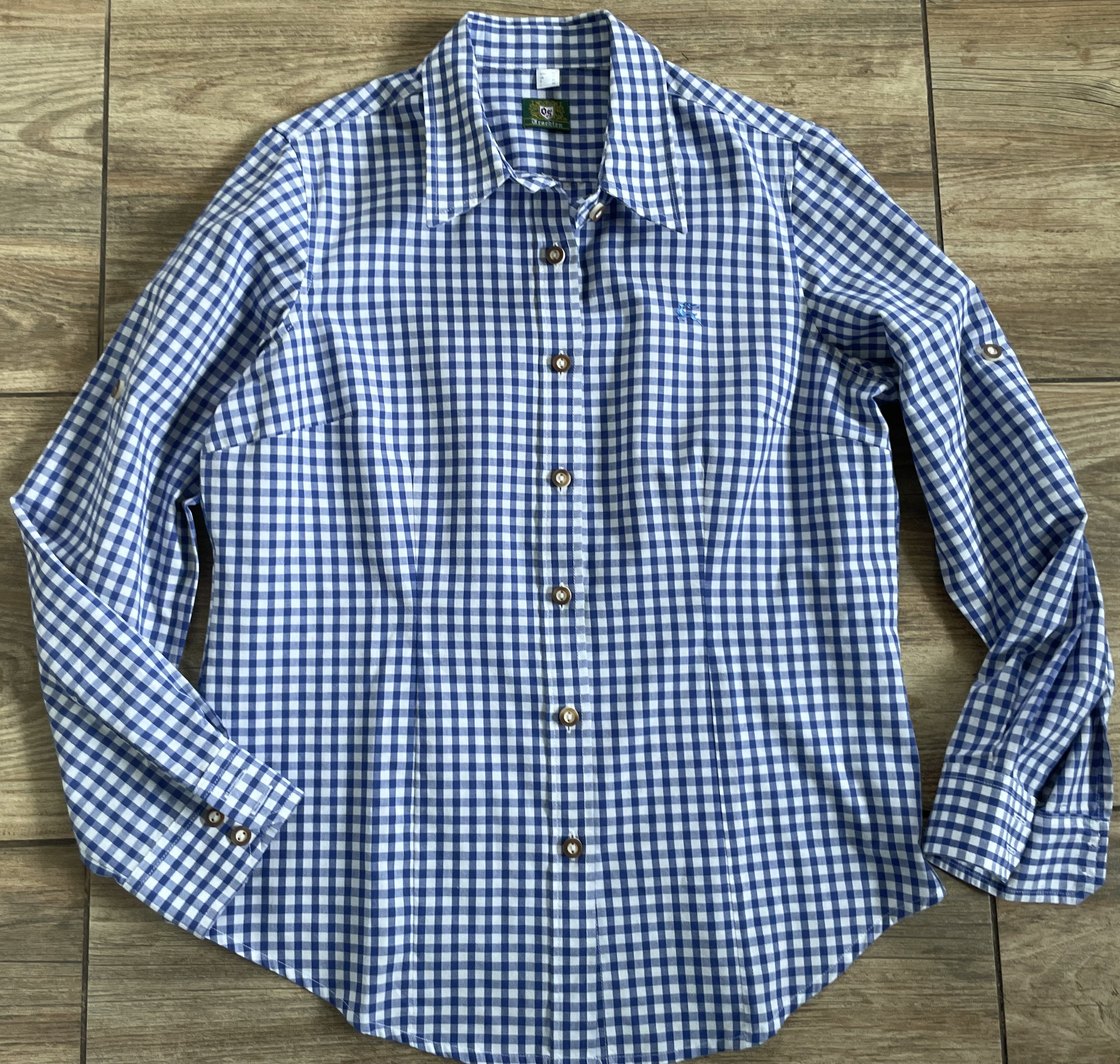 modro-bílá, roll-up efekt na rukávu, super stav, délka 69cm, délka rukávu 60,5cm, šíře přes prsa 55,5cm Velikost: 42 Značka: TRACHTEN celý popis