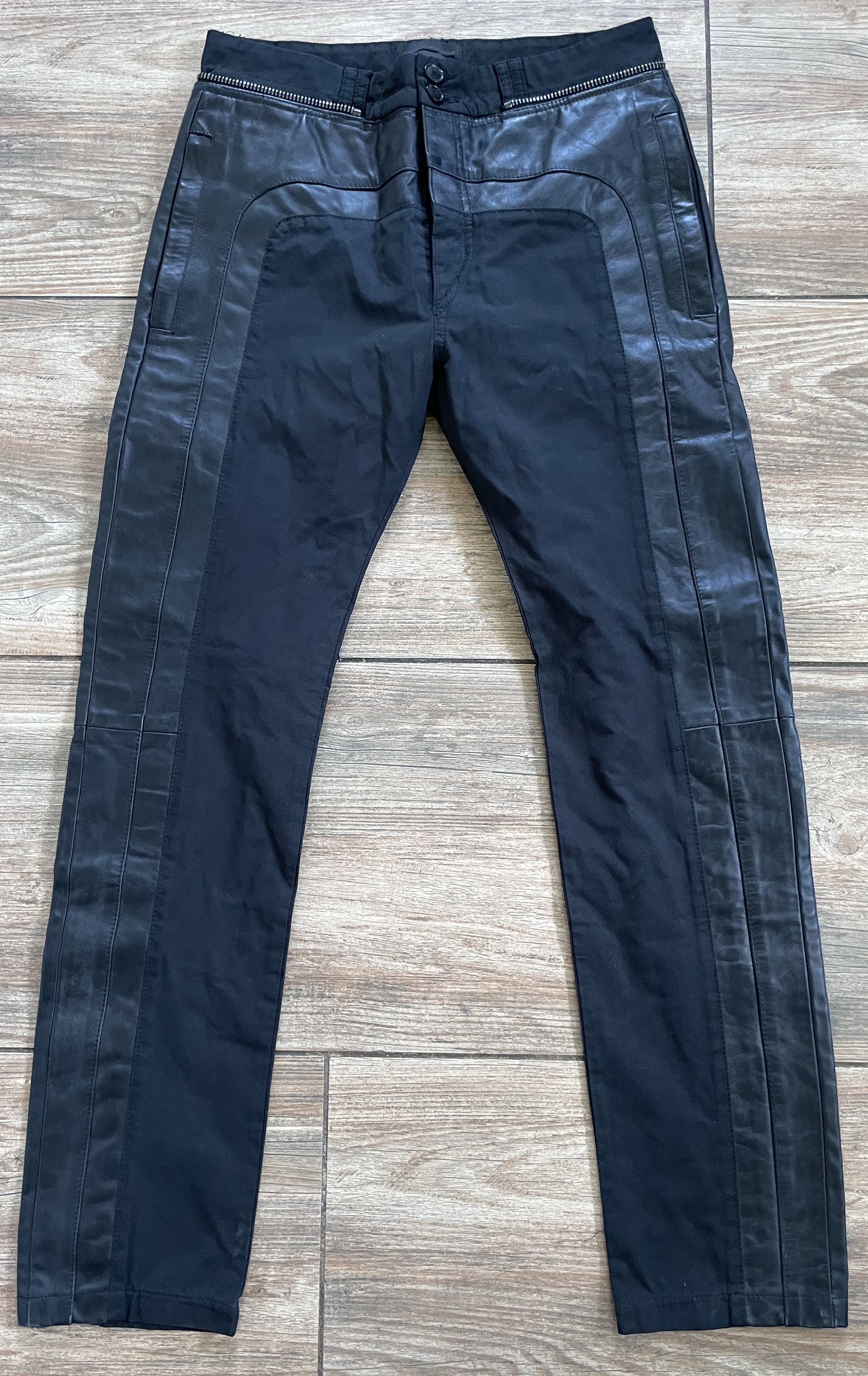 černé, kombinace kůže a rifloviny, super stav, vel. odhaduji na M, pas šíře 39cm, délka100cm, boky šíře 48cm