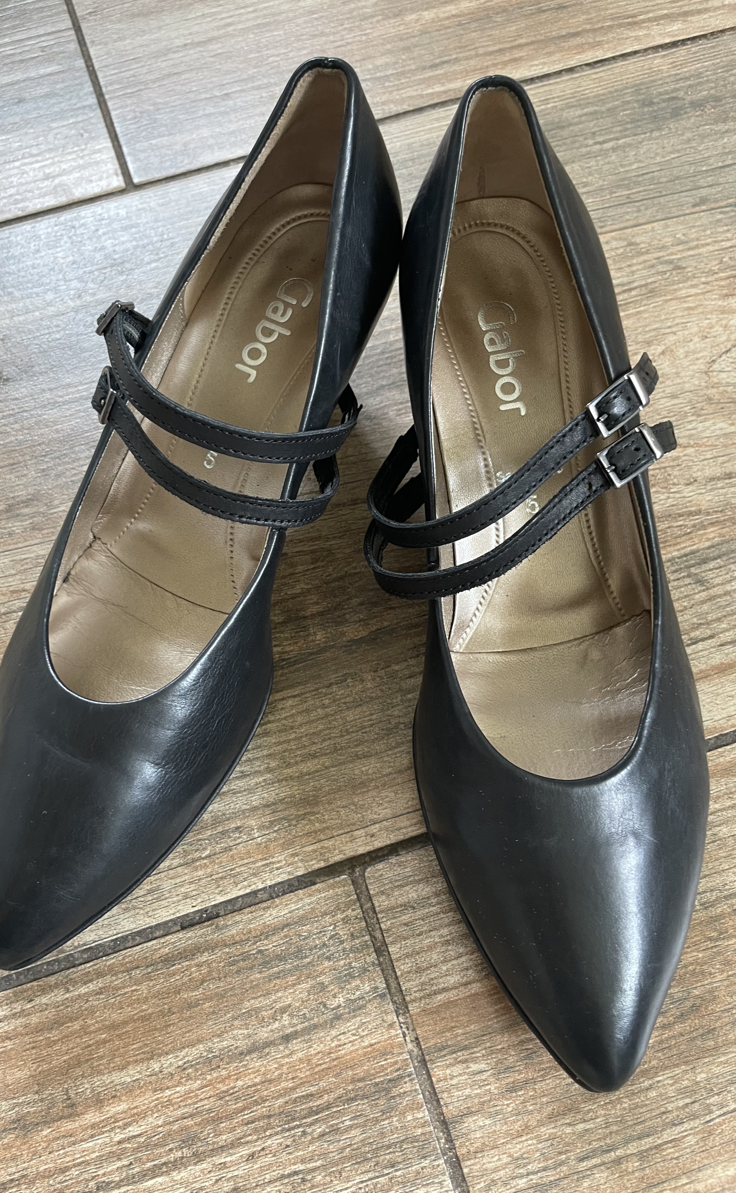 Černé lodičky s páskama přes nárt (jsou mírně pružné), kožené zvenku i uvnitř, stélka je měkčená-pohodlná, velmi pěkný stav, jen drobné známky použití. Stélka cca 25,5 až do špičky, odhaduji na chodidlo cca max. 24,5 cm