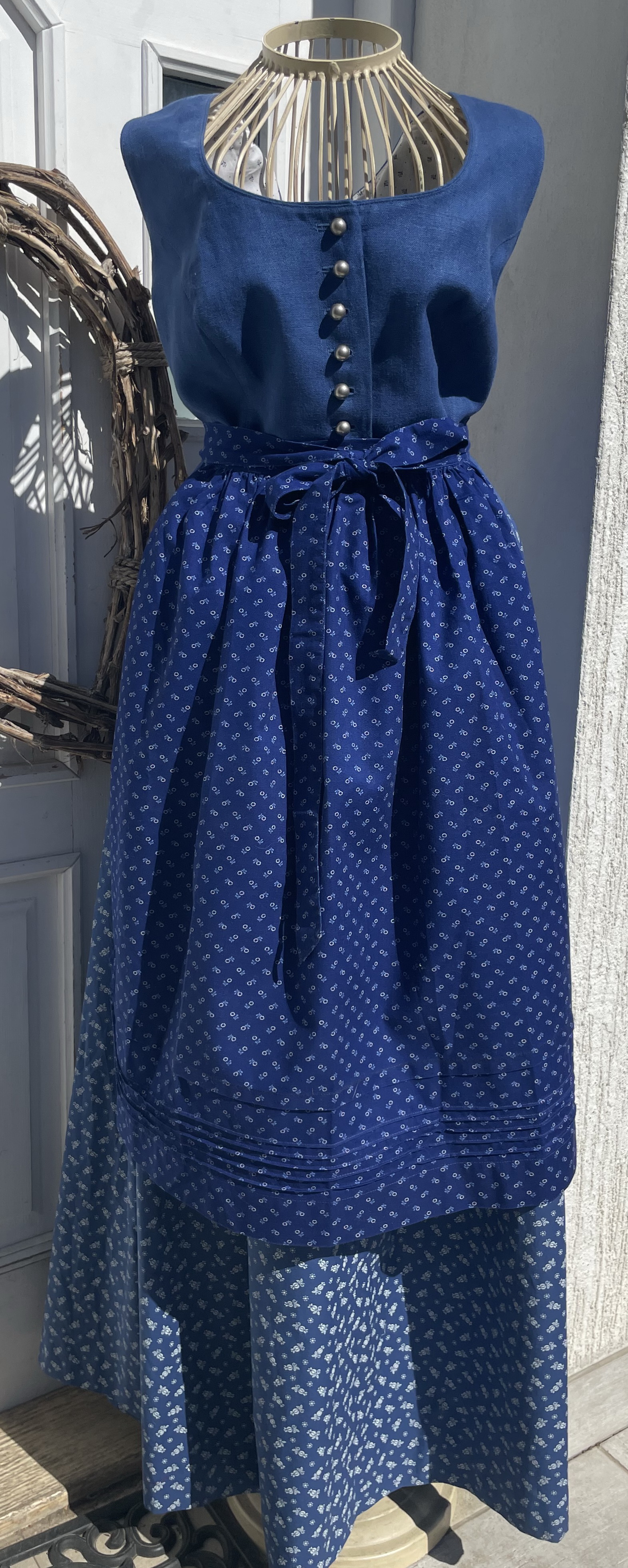 Dámské dlouhé šaty se zástěrou, horní část je 100% len, sukně 100% bavlna, podklad horního dílu je také bavlněný, výborný stav, velikost uvedena 48, odhaduji na vel. 46.