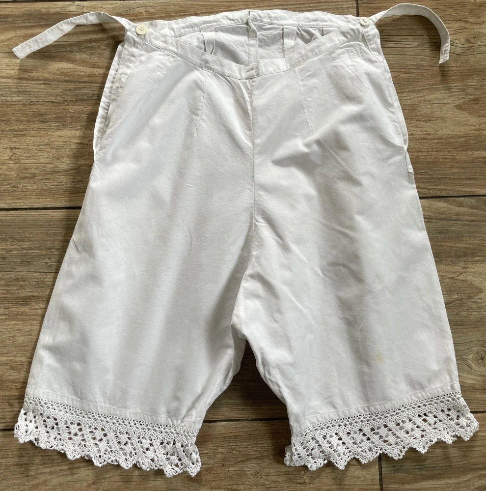 Dámské bílé spodky lemované háčkovanou krajkou, v pase zapínání na knoflíky na stranách, dole krajka, velikost odhaduji na 36, materiál odhaduji na bavlnu, na koleni dva nepatrné flíčky, zachovalé.