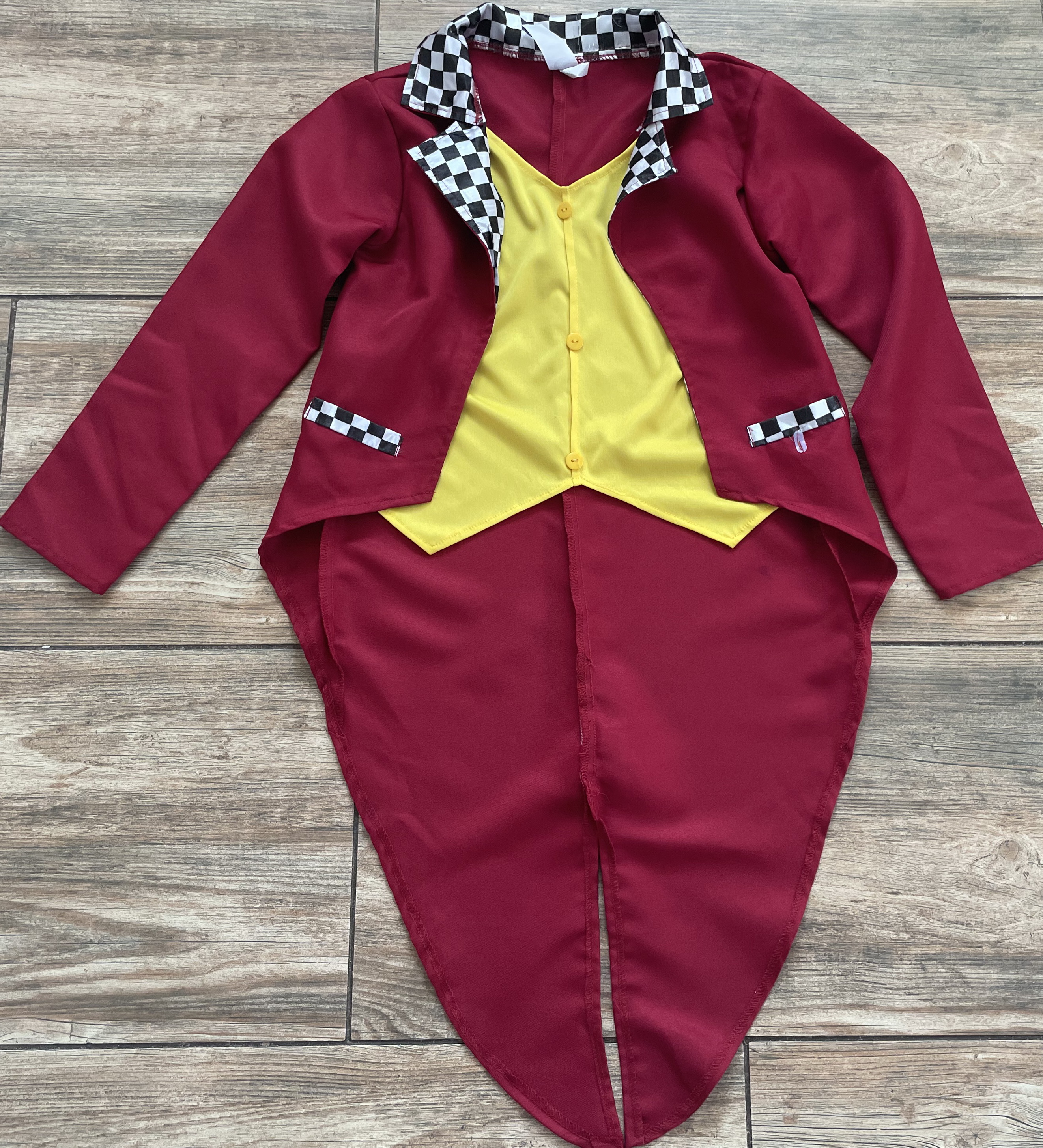 dětský frak v bordo barvě, žlutá vestička, vzadu bílý ocásek, pěkný stav