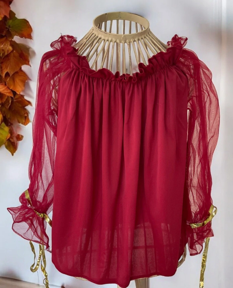 lehká vínová halenka s průsvitnými rukávy, polyester, u výstřihu guma, pěkný stav celý popis
