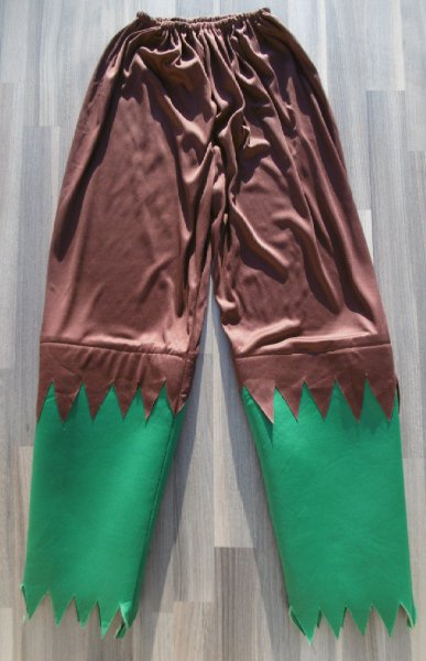 hnědé kalhoty se zeleným polstrovaným zakončením, v pase pružná guma, vel. odhaduji na S, pas šíře 25-57cm, délka 102cm celý popis