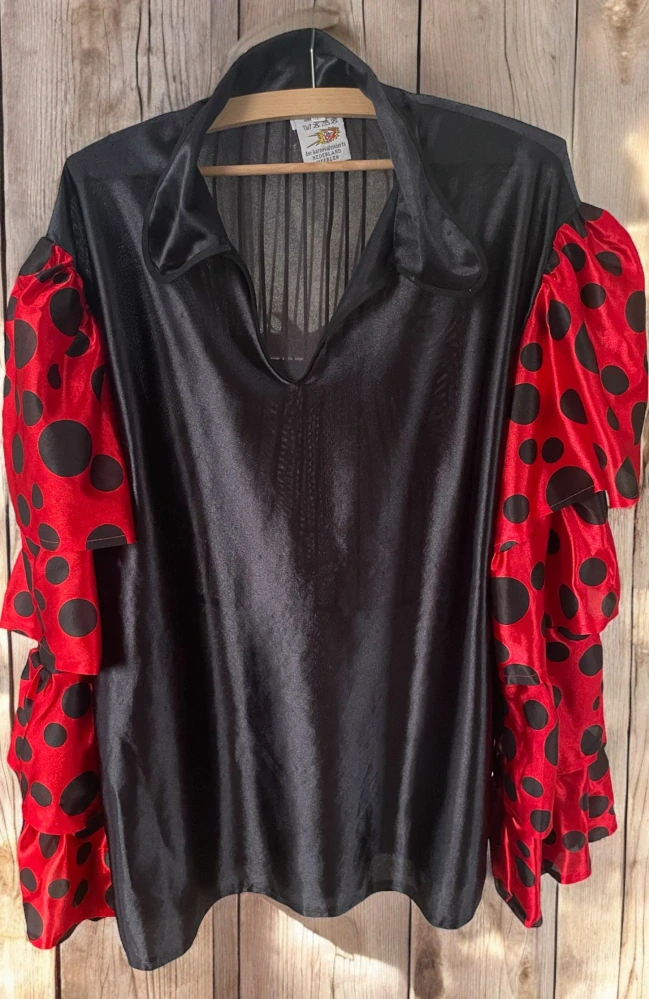 černá karnevalová košile s volánovými puntíkatými rukávy, pěkný stav, vel. odhaduji na XL-XXL
