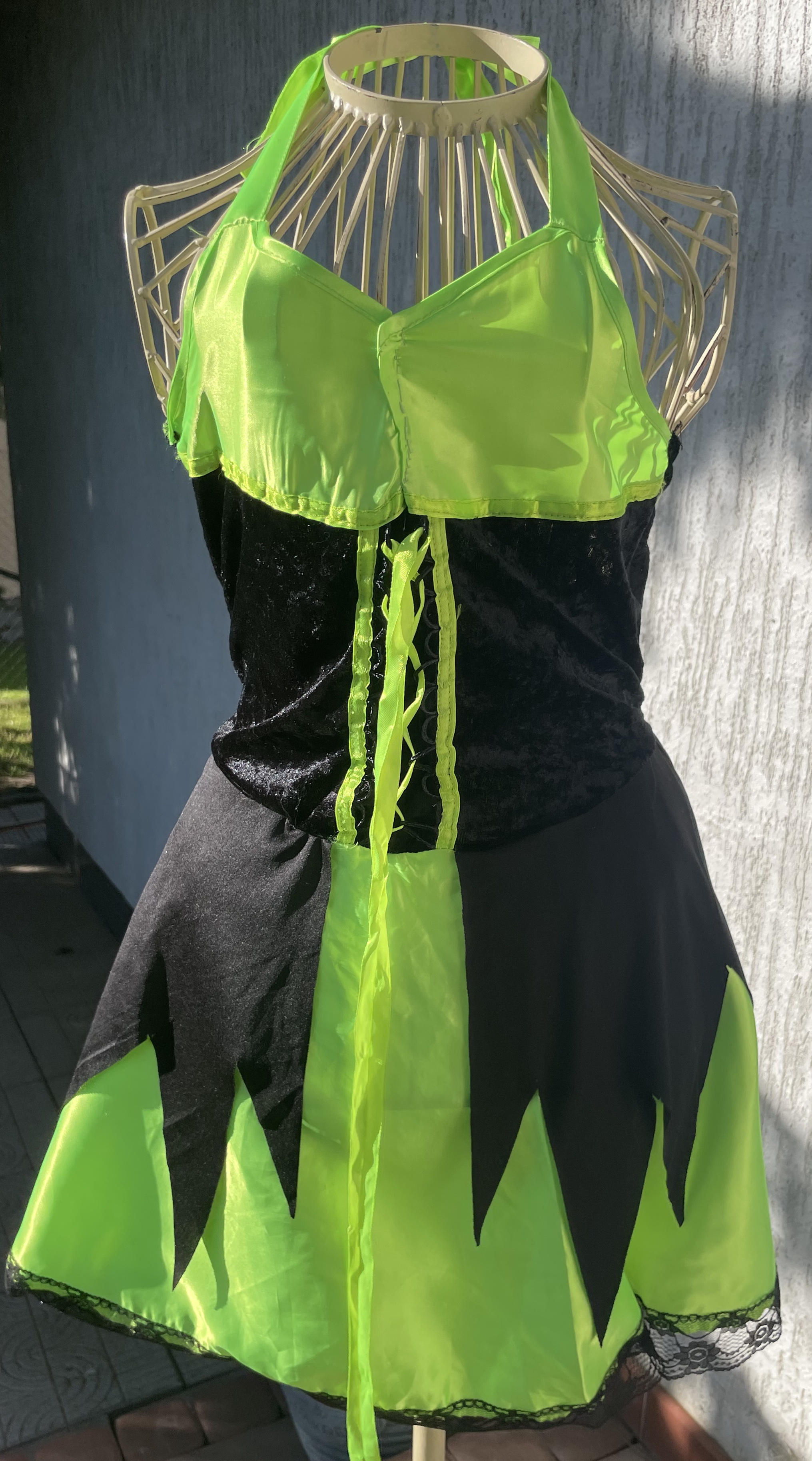 Dívčí karnevalové černo-zelené šaty, nahoře částečně sametové, pružné, na zavázání za krku, na prsou uprostřed zúžené, zachovalé, velikost odhaduji na 122. celý popis