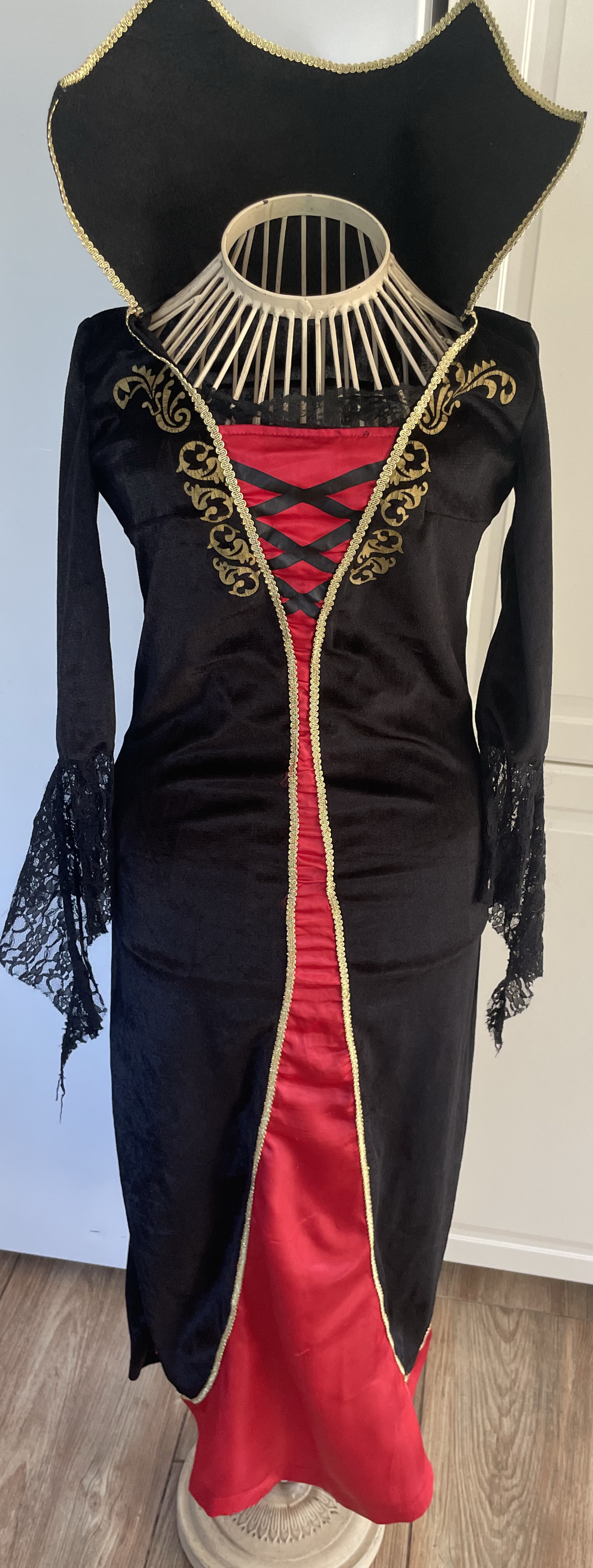Černo-červeno-zlaté sametové šaty s velkým límcem, červený satén je trochu opravovaný, celkový dojem je pěkný, odhaduji na 10-13 let.