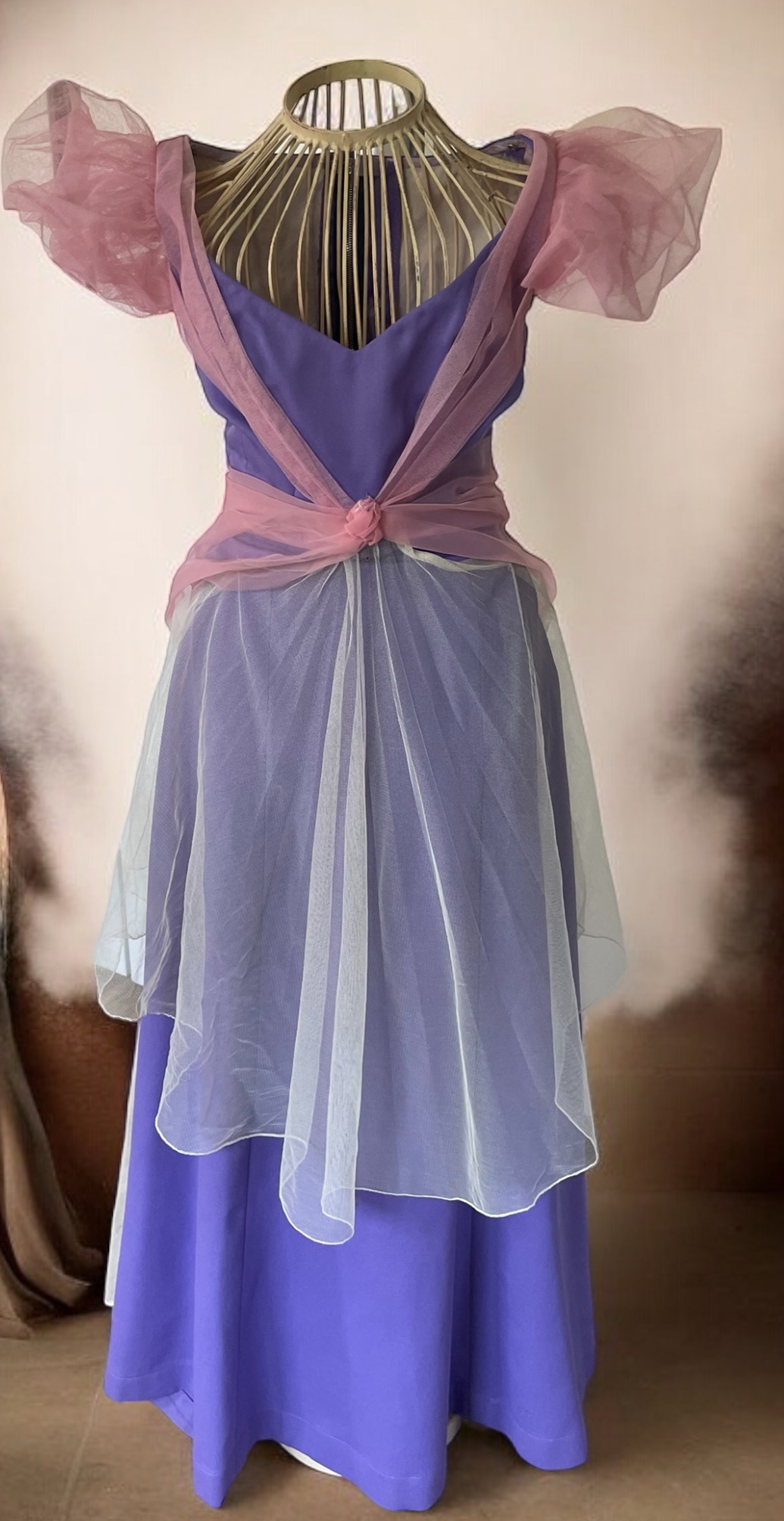 lila barva v kombinaci s růžovou, vzadu prodloužené, zapínání na zip,  ručně šité, zachovalé ,vel. odhaduji od 13 let celý popis