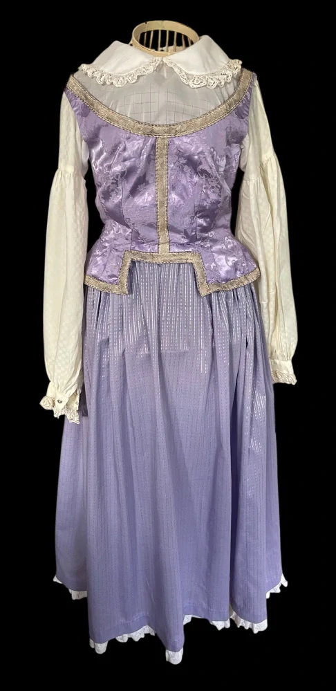 Dámské šaty resp. živůtek a sukně v jednom, fialkovo-bílá barva, živůtek má rozbitý zip, jinak celkový dojem je pěkný, vel. odhaduji na 36/38 celý popis
