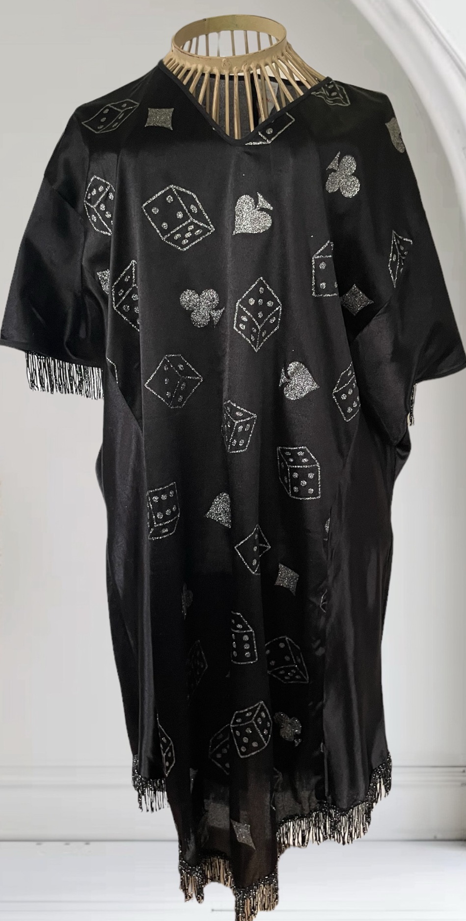 zachovalé šaty se stříbrným potiskem, délka 96cm, šíře přes prsa 61cm celý popis